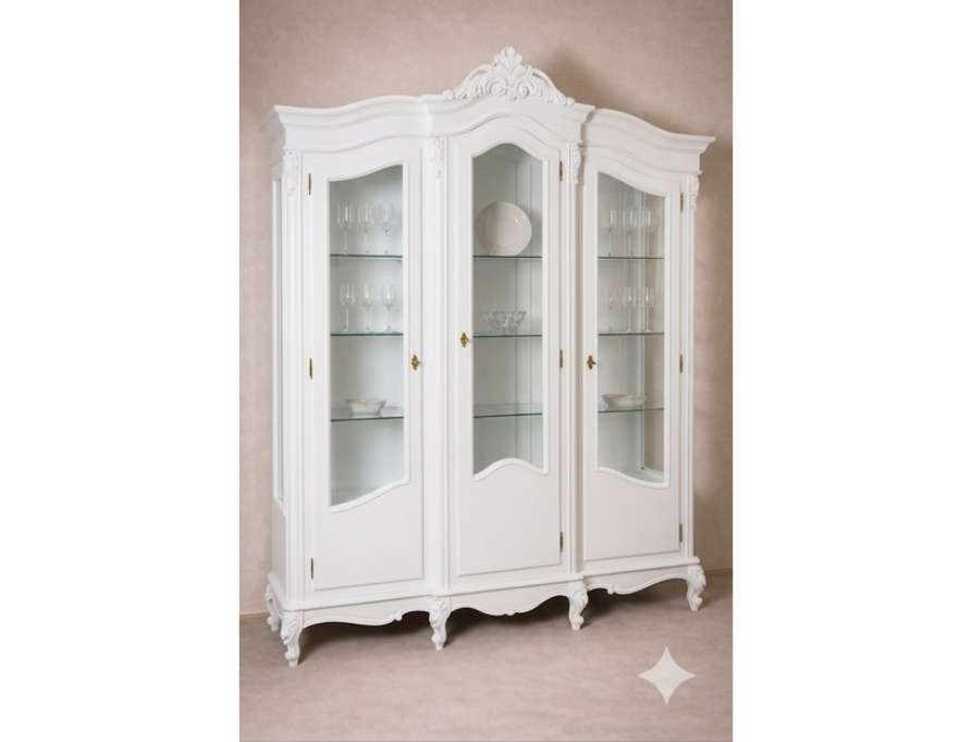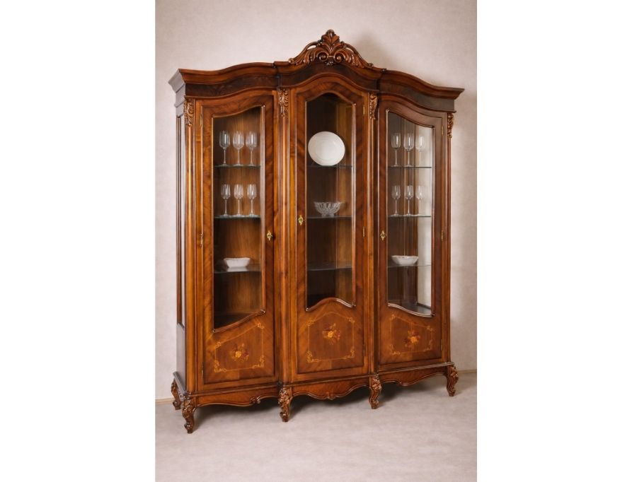 Cristalier cu 3 uși din lemn masiv de fag și tei, cu furnir natural, intarsii florale manuale și coronament sculptat. O piesă de colecție care transformă sufrageriile în spații de eleganță autentică.