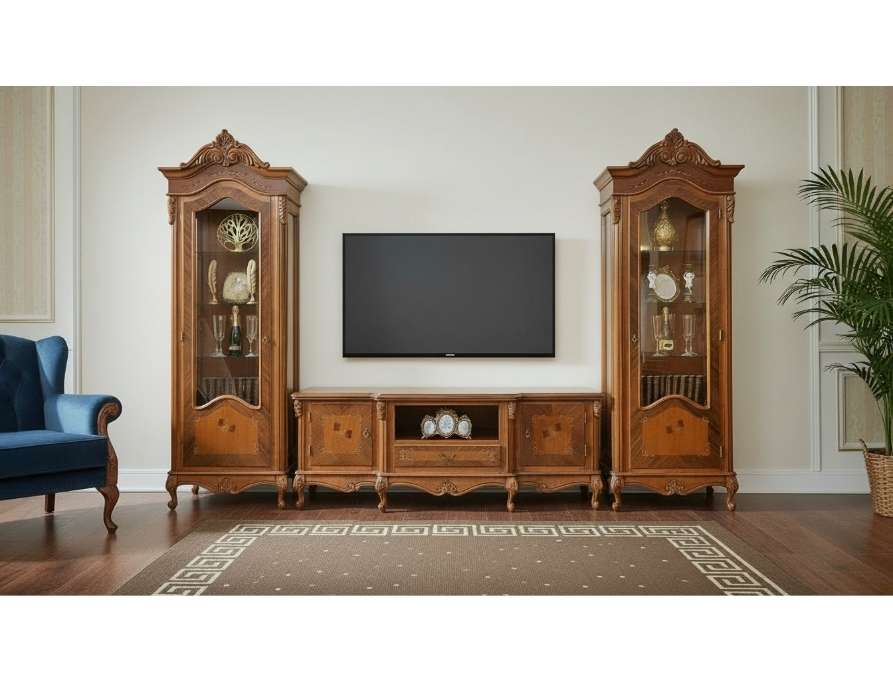 Expunere și Organizare: Vitrinele spațioase permit o prezentare elegantă a cristalurilor, în timp ce comoda TV centrală este proiectată să găzduiască echipamentele media moderne într-un cadru clasic.