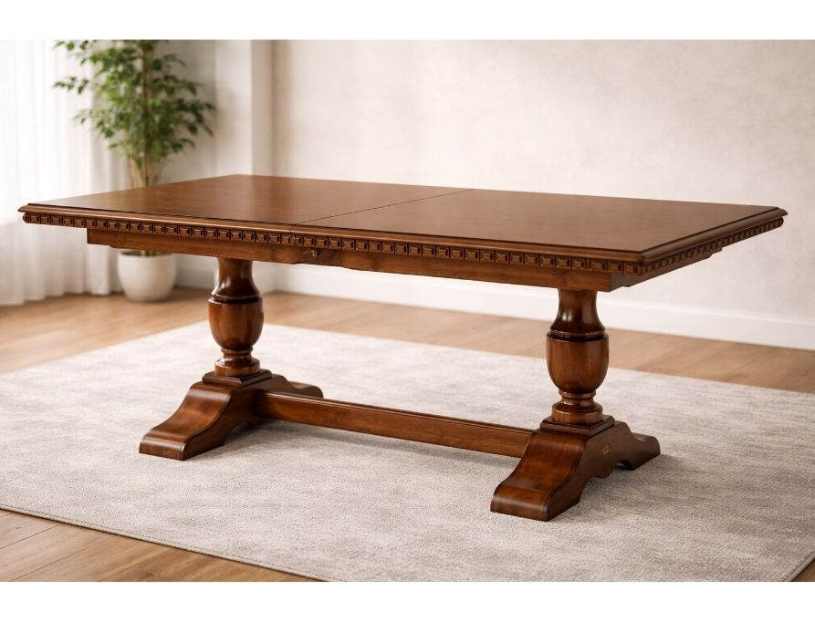 Masă de dining din lemn masiv cu finisaj nuc cald, blat extensibil cu bordură dințată sculptată pe toată lungimea. Susținută de două picioare tip balustre, unite printr-o traversă centrală și ancorate pe baze rectangulare solide.
