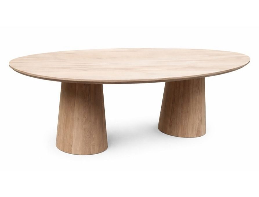 Masă cu blat oval generos din stejar natural, susținută de două baze conice masive. Forma simplă și curată, fără ornamente, pune în valoare textura naturală a lemnului și se integrează ușor în orice interior modern.