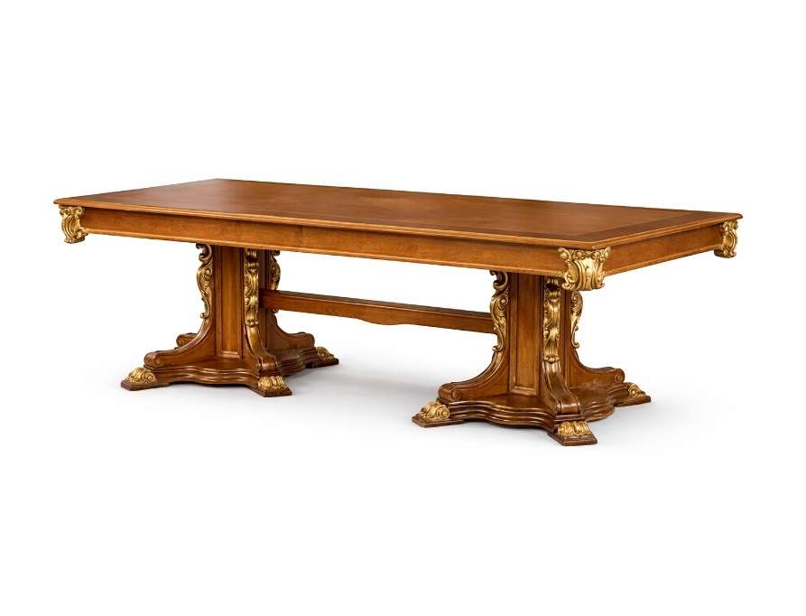 Masă de dining de reprezentanță din lemn masiv cu finisaj nuc-roșcat și ornamente aurii. Blatul generos este susținut de două postamente duble masive, decorate cu volute și acante aurite, unite printr-o traversă centrală.