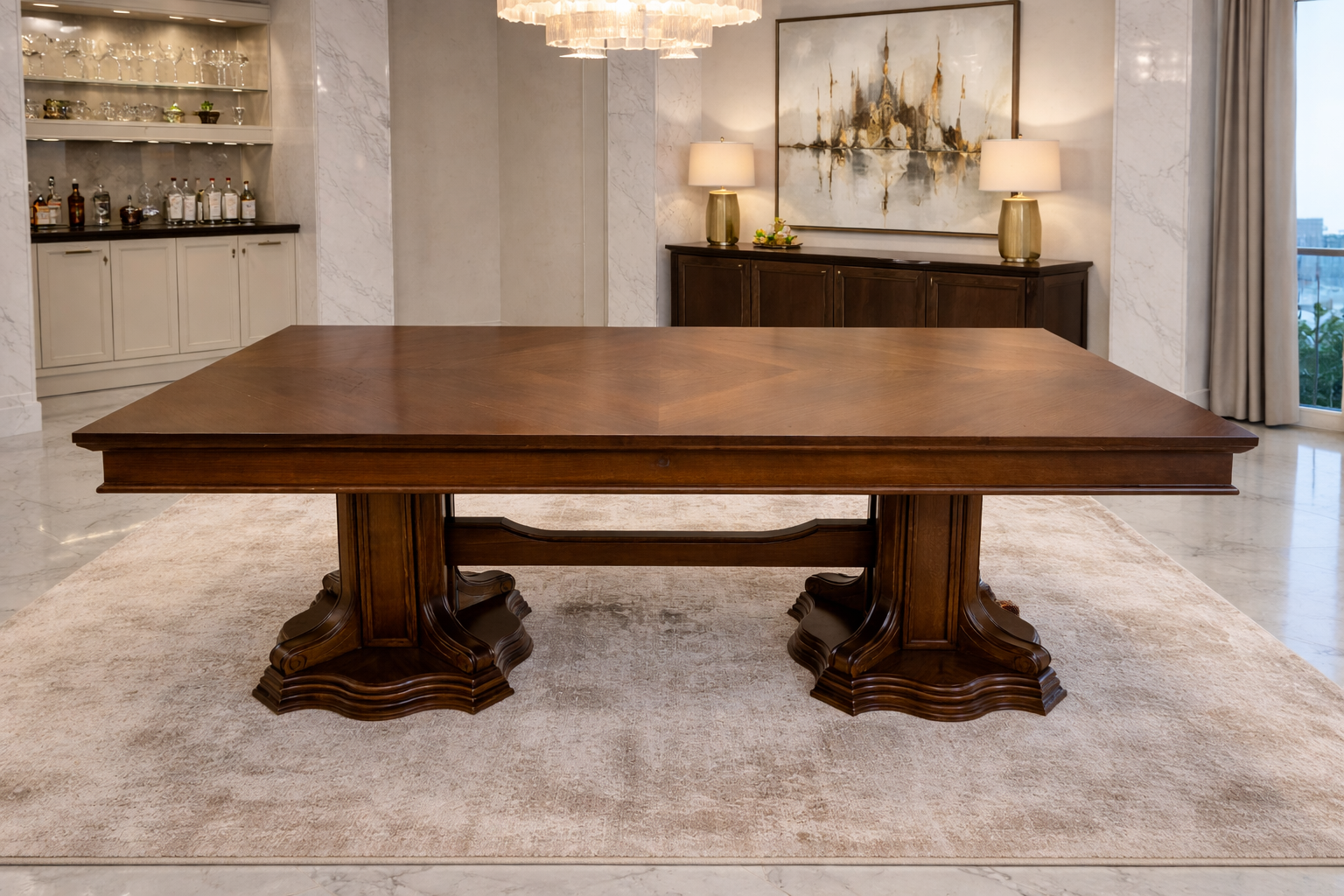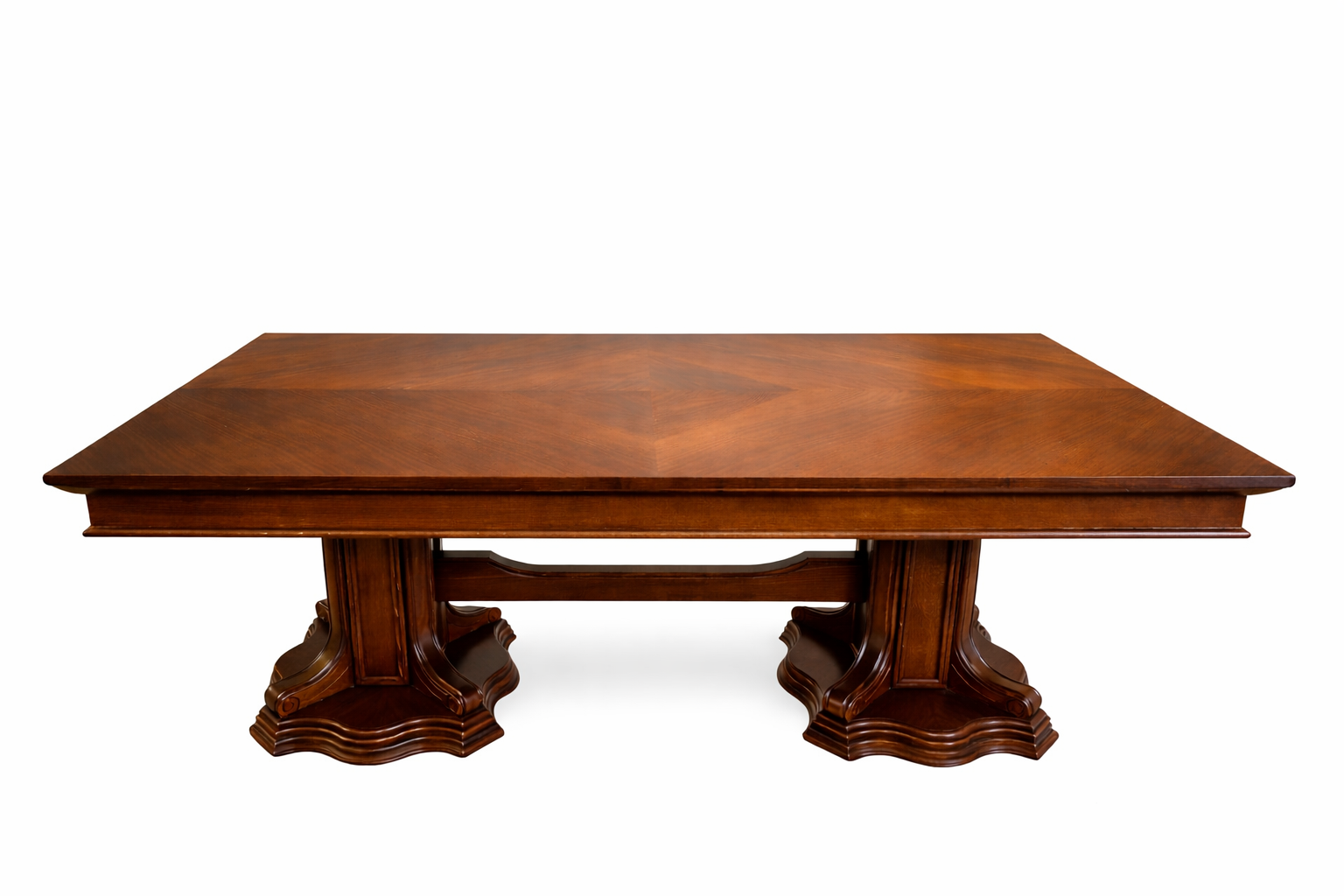 Masă de dining din lemn masiv cu finisaj nuc, blat larg cu furnir în model geometric și margine profilată dublă. Susținută de două postamente pătrate canelate cu bază sculptată în formă de volută, unite printr-o traversă centrală arcuită.