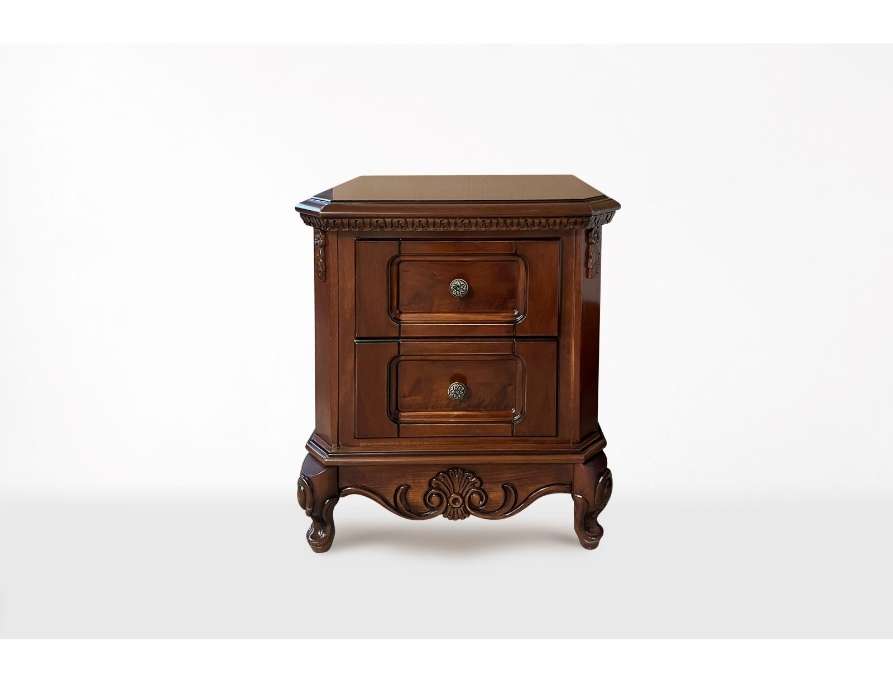 • Măiestrie în Detalii: Picioarele curbate și baza ornamentată sunt sculptate manual, oferind noptierei o prezență sculpturală. Mânerele metalice, cu design antichizat, completează estetica clasică și oferă o experiență tactilă plăcută la fiecare utilizare.