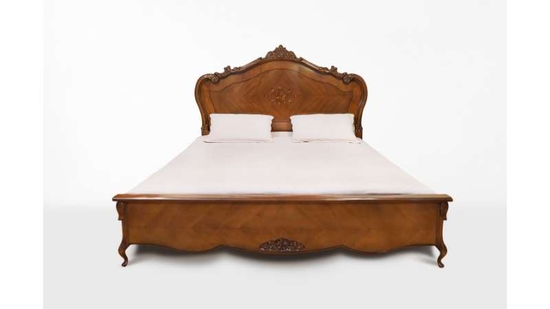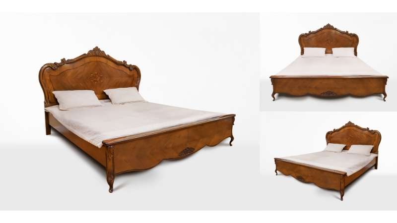 Lemn masiv de fag și tei · Furnir chevron · Sculptură bogată · Intarsie florală Patul Isabella în finisaj natur revelează în toată plenitudinea sa bogăția lemnului masiv — o piesă în care sculptura artizanală, furnirele prețioase și intarsia manuală se reunesc într-un ansamblu de o frumusețe clasică desăvârșită. Construit din lemn masiv de fag și tei, cu panouri furniruite în model chevron pe tăblie și ramă, fiecare suprafață capătă adâncime și căldură naturală. Coronamentul tăbliei este o adevărată operă de sculptură aplicată — motive florale elaborate, volute și acanthus sculptate manual încununează o tăblie de mare efect vizual. În centrul panoului furnirut, o intarsie florală realizată din esențe de lemn cu nuanțe diferite adaugă rafinamentul unui detaliu unic, imposibil de reprodus industrial. Sculpturile laterale ale tăbliei și medalionul sculptat de pe centură completează un limbaj decorativ coerent și generos. Rama patului, cu profil sinuos, furnir chevron și picioare cabriole, continuă cu naturalețe eleganța tăbliei. Finisajul natur al lemnului, lucios și cald, scoate în evidență textura naturală a furnirului și profunzimea sculpturilor — o alternativă de caracter față de varianta lăcuită a aceleiași colecții.