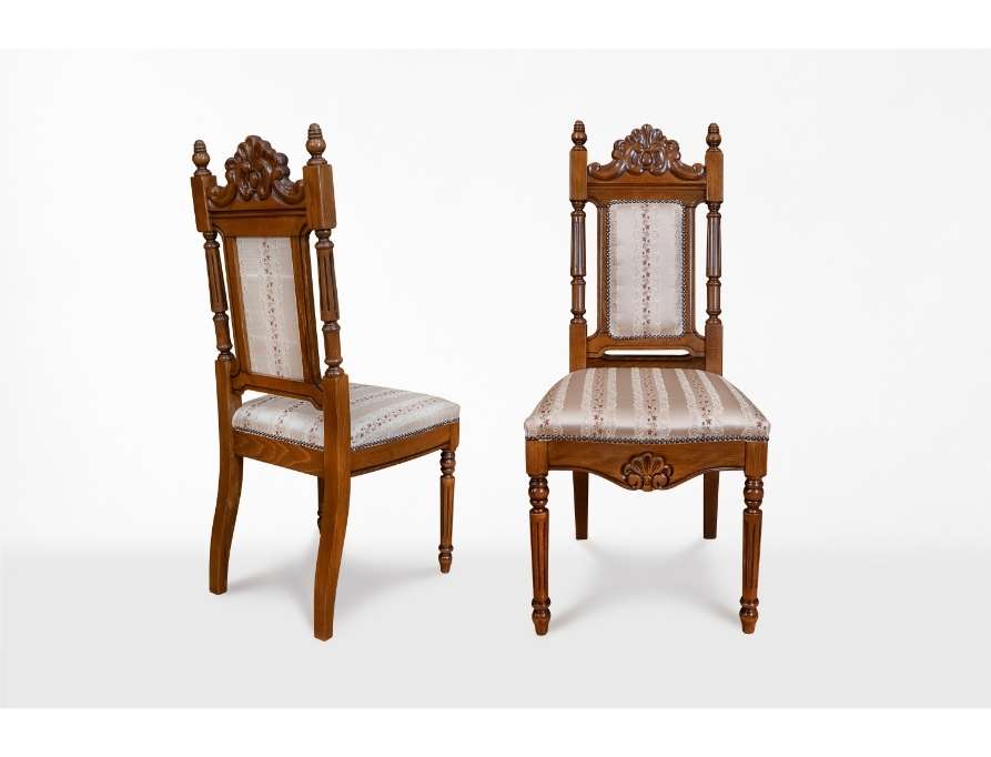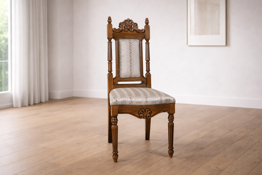 Scaun cu spătar înalt dreptunghiular din lemn masiv nuc, flancat de coloane canelate toronate și încununat cu un coronament sculptat în motiv scoică. Tapițeria din mătase jacquard cu model floral fin, aplicată cu ținte decorative, acoperă atât spătarul cât și șezutul generos.